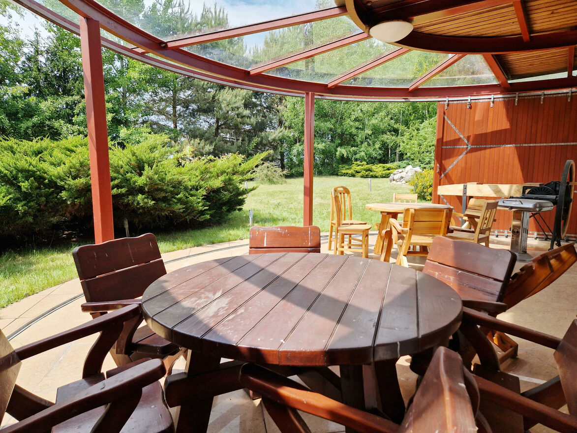 Na posesji dodatkowo zlokalizowany budynek gospodarczy skrywający trzy pomieszczenia techniczne oraz toalety.